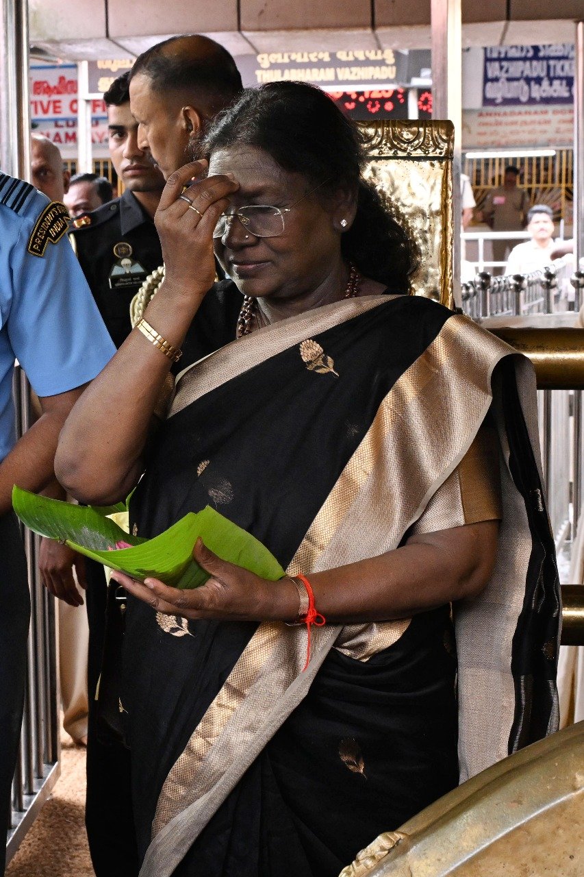 A special vehicle ferried her along the 4.5 km Swamy Ayyappan Road, believed to be the first vehicular ascent for a sitting President. At Sannidhanam, she was welcomed traditionally by the priest and Kerala Devaswom Minister V.N. Vasavan. Balancing the Irumudi on her head, she climbed the 18 sacred steps and offered prayers through the returning ritual aarti, followed by a visit to Malikapuram Temple and a simple lunch at the TDB guest house.